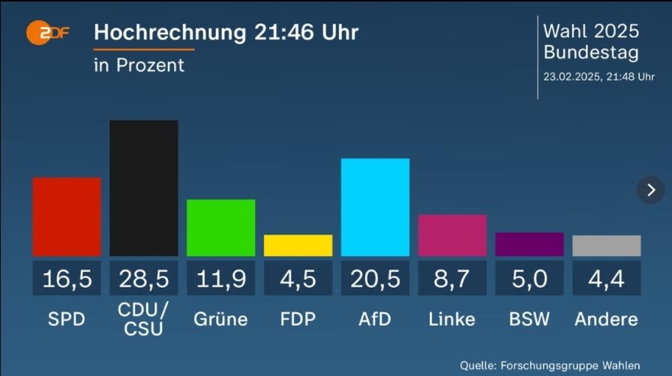 At the same time, CDU/CSU appears to be securing 28.5%, AfD 20.5%, SPD 16.5%, the Greens 11.9%, and the Left 8.7%.
