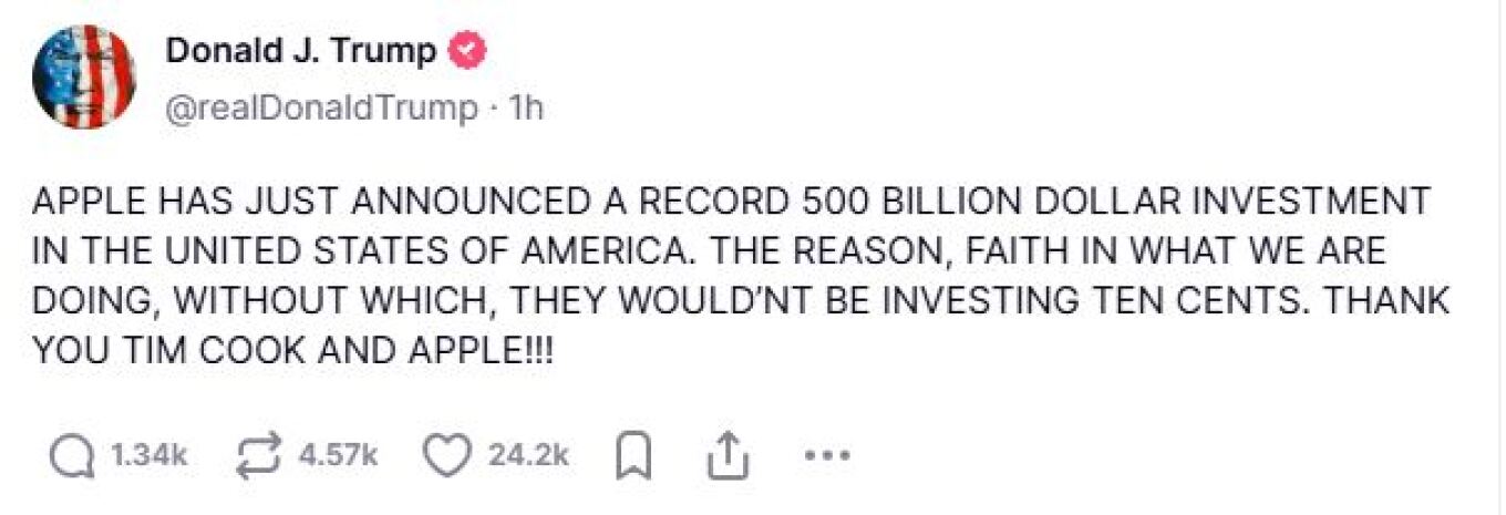 At the same time, in a post, the US president thanked the company for its investment and said: “Apple has announced a record $500 billion investment in the US. The reason is the belief in what we do without which they wouldn’t invest 10 cents. Thanks to Tim Cook and Apple.”