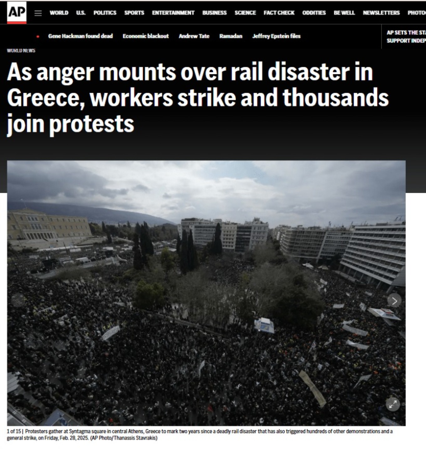 The Associated Press similarly notes the public outrage in Greece, stating that strikes and mass protests have brought thousands into the streets over the railway disaster.