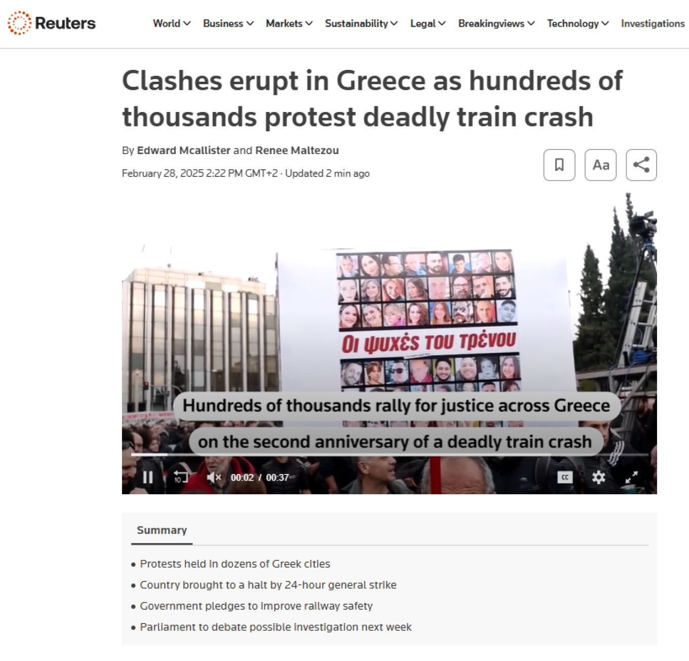 “Clashes erupt in Greece as hundreds of thousands protest the deadly train disaster.”