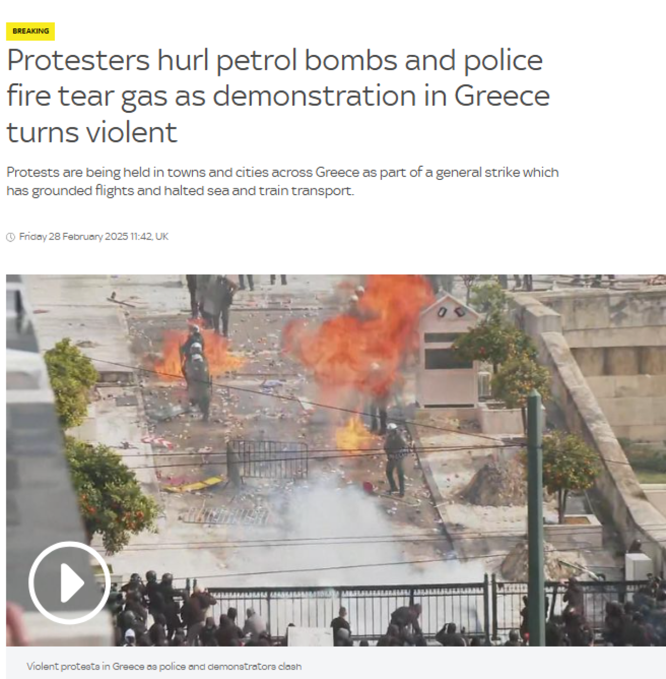 “Protesters hurl Molotov cocktails, and police respond with tear gas as demonstrations in Greece turn violent. Protests are taking place in cities large and small across Greece as part of a general strike, which has grounded flights and halted maritime and rail transport,” SkyNews reported.