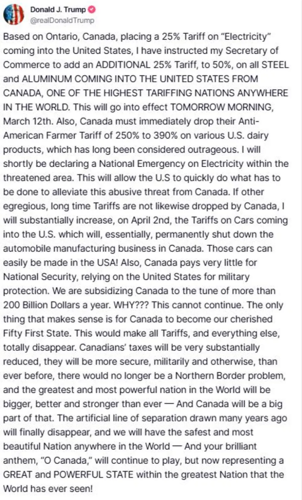 Trump announced in a lengthy statement that an additional 25% tariff on steel and iron imports from Canada would be immediately imposed. This new tariff will take effect tomorrow, adding to the 25% tariff already planned and signed into law, though temporarily “paused” until April 2nd.