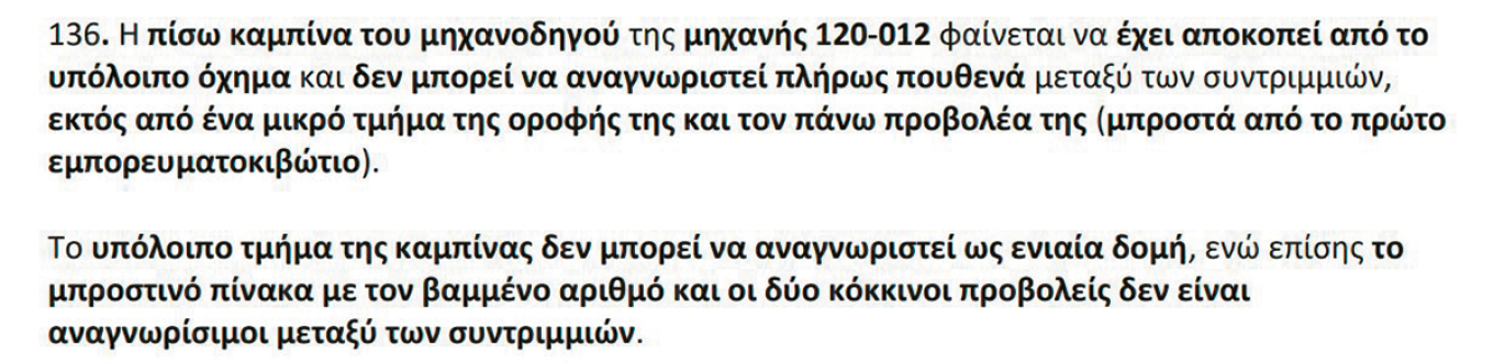 How do we know this? One week after the report’s publication, firefighters from the Arson Crimes Investigation Directorate (DAEE) of the Fire Department and forensic experts discovered the “missing” parts of the specific locomotive in Koulouri, 10 kilometers from the center of Larissa, where the wreckage from the deadly collision had been stored. They even found the driver’s seat of the cabin. Since even that was not burned, an explosion inside the cockpit of the electric locomotive is ruled out. Case closed.
