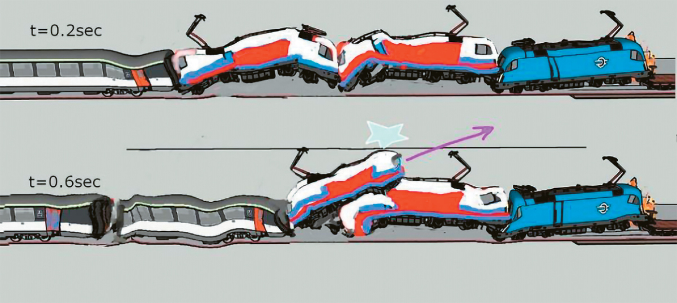 EODASAAM states in its report that the missing piece from the second electric locomotive detached while on fire and caused a blaze. However, a photographic document of the rear section of the freight train’s cockpit, published by THEMA, clearly shows significant material deformation due to the collision, but no signs of fire. Additionally, it is well known that the ill-fated engineers of the freight train died in the collision—they were not burned.