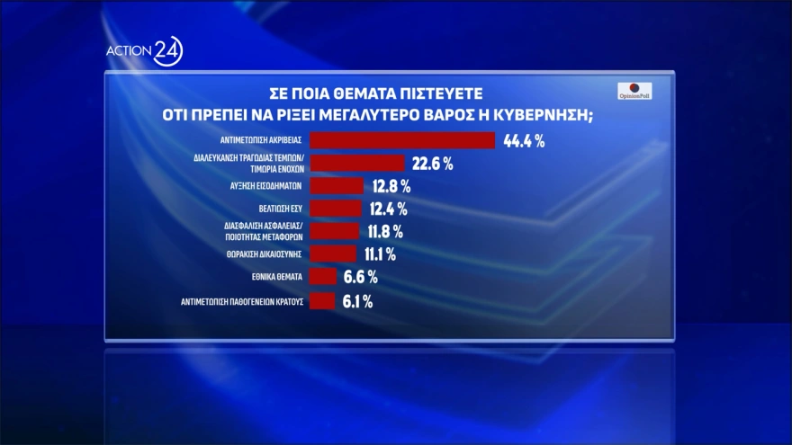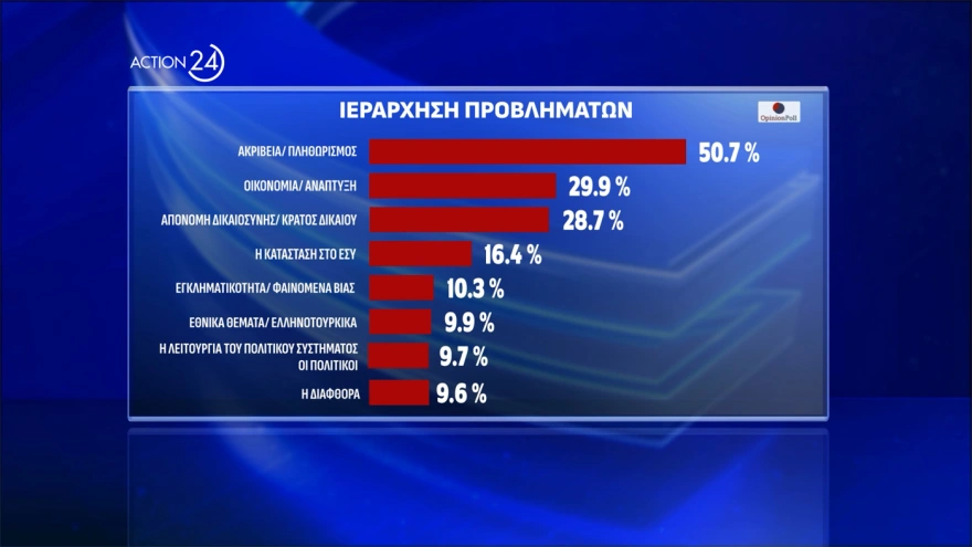 - Justice/Rule of Law: 28.7% (Appearing for the first time, likely due to the Tempi tragedy)