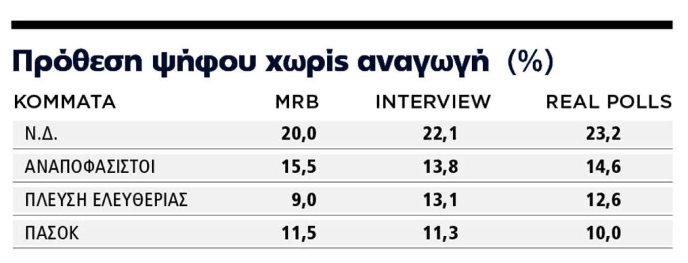 In this context, New Democracy leads in voting intention at 23.2%, followed by Plefsi Eleftherias at 12.6%—a percentage lower than that of the undecided voters.