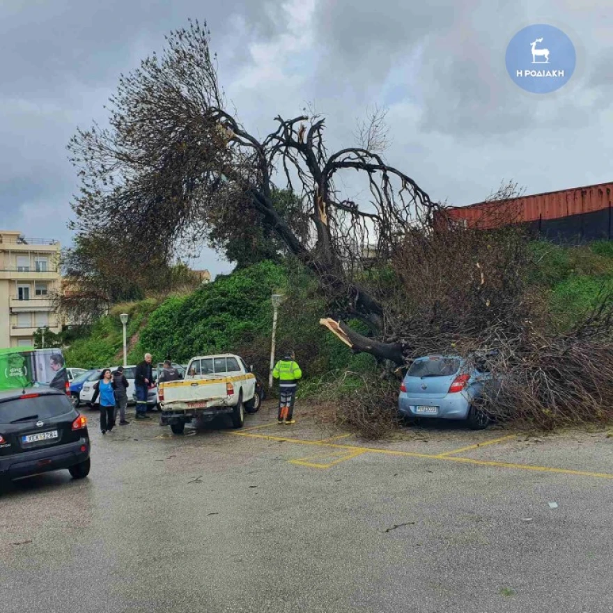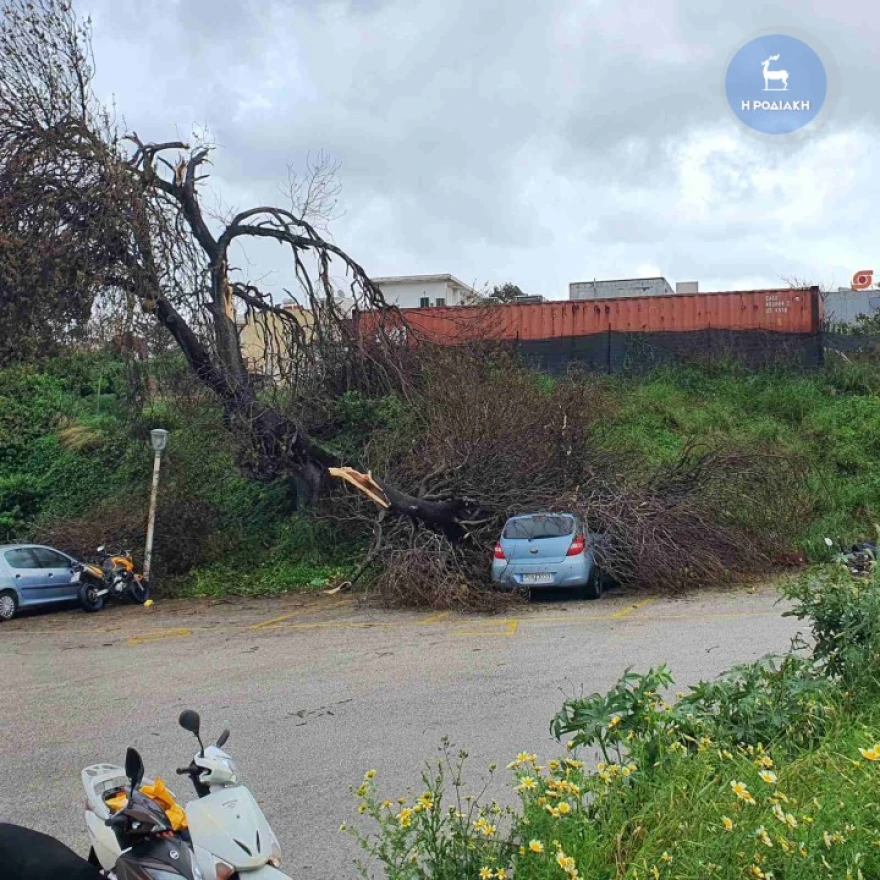The strong winds caused trees to fall and broken windows, while pots from balconies fell into the street and vehicles were damaged. According to rodiaki.gr no injuries were reported.