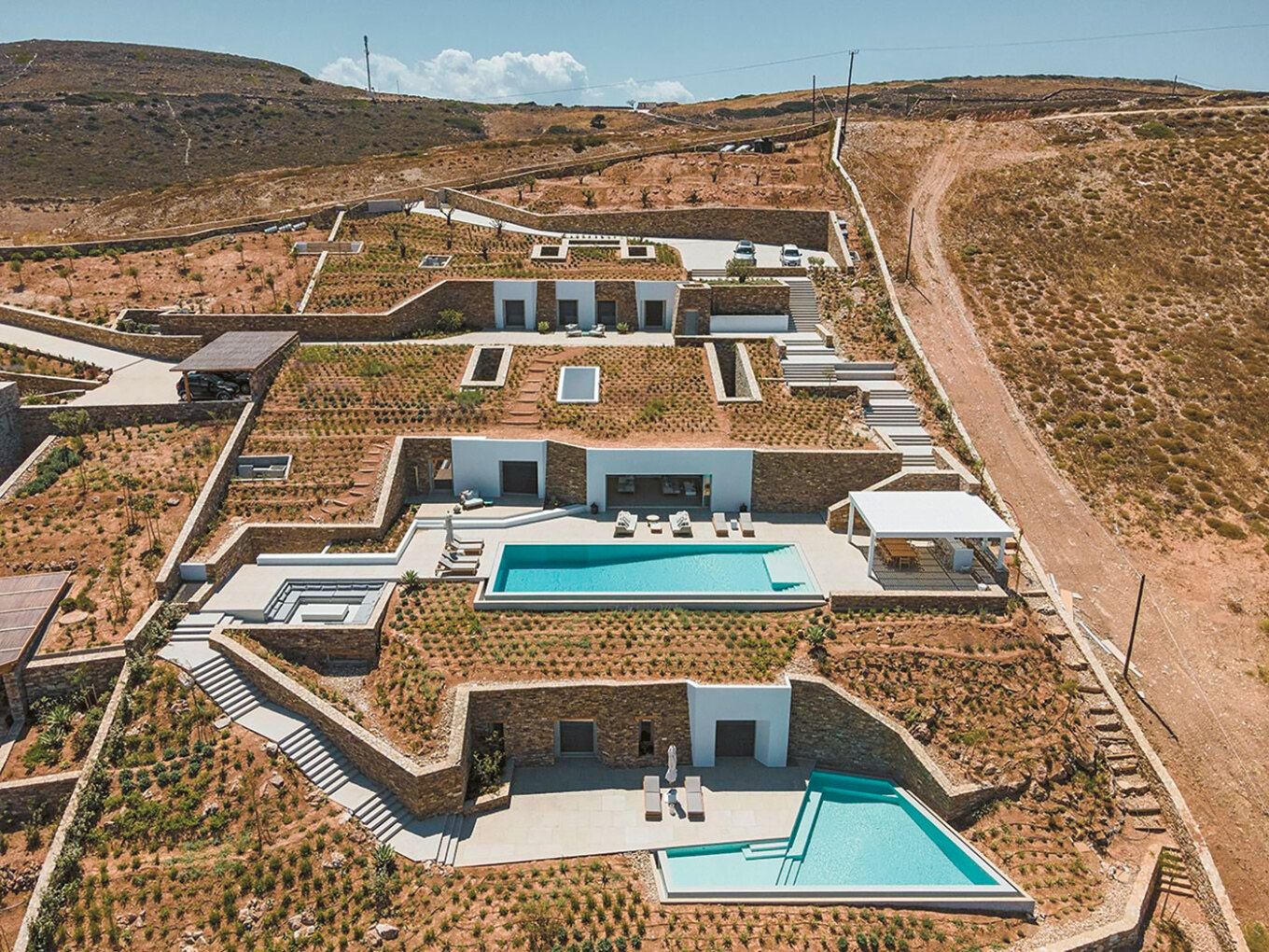 They keep a low profile and do not engage with island life. Their Range Rovers stay parked in underground or open-air garages, and the residences serve as sanctuaries of privacy. The emergence of these underground structures signals a new era for Antiparos.