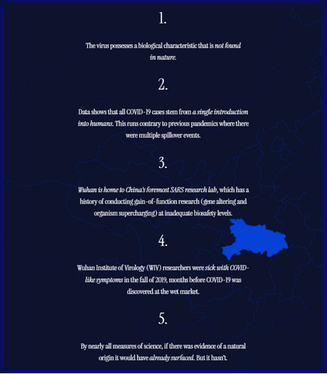 Five arguments are listed, in particular that the first cases of the disease occurred in Wuhan, China, where a virology laboratory known for its research into coronaviruses is located.