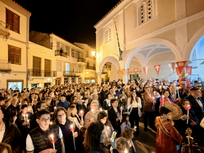 The Resurrection Service at the Metropolitan Church of Saint George in Nafplio was led by Metropolitan Nektarios of Argolis. In an atmosphere of deep devotion on Holy Saturday night, the Metropolitan chanted “Christ is Risen” to the joyful sound of church bells ringing across Nafplio.