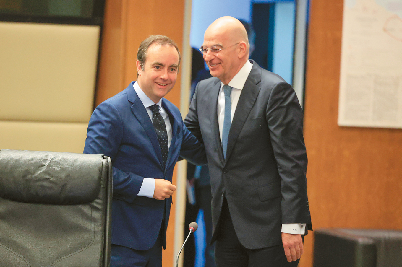 Defense Minister Nikos Dendias with his French counterpart Sébastien Lecornu, who signed a contract for the purchase of 16 Exocet missiles.