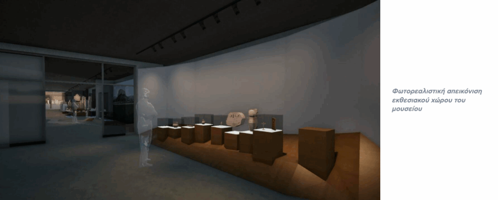 The permanent exhibition of antiquities at the Timeless Museum of Trikala is expected to be developed on the first floor of the building, with a total area of approximately 580 square meters. It will be organized into three sections, following the layout of the spaces, with the introductory section in the center and two large halls on either side. The design of the exhibition does not require structural interventions on the shell. The granted building will house, on the two upper floors, the offices of the Trikala Antiquities Ephorate and the necessary support spaces, such as reception, gift shop, cloakroom, café, event space, storage rooms, conservation laboratories, and other auxiliary services.