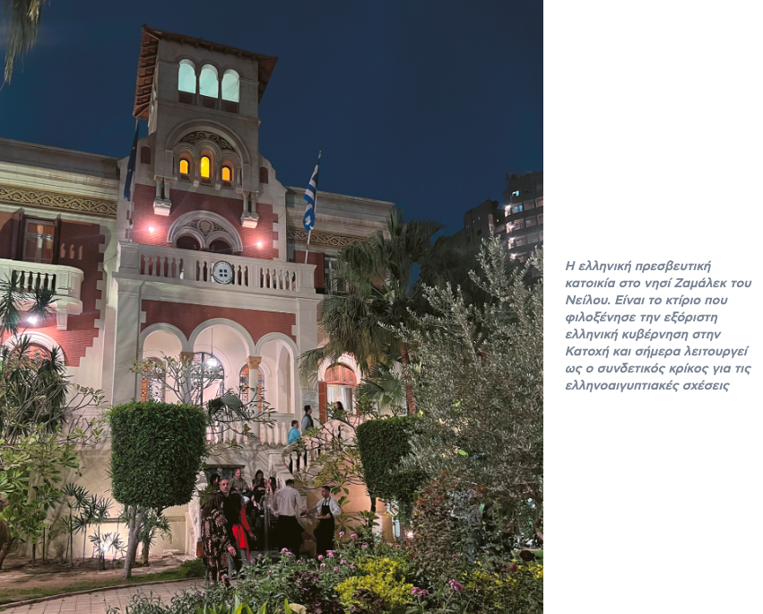 The river holds its own magic, which we feel as soon as we arrive at Zamalek Island, where the Greek ambassador’s residence is located, a beautiful building that once hosted the exiled Greek government during the Occupation and today serves as a link for the strong Greek-Egyptian relations. Just a few days after Ramadan—still adorned with shiny ribbons in the neighborhoods, which Arabs use to honor their major holiday—the guests dress in their finest and are graciously hosted by Greek Ambassador Nikolaos Papageorgiou in the lovely gardens.