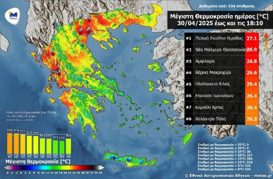 Giannis Kallianos on MEGA TV reports that from the weekend, especially Monday, May 5, temperatures will reach up to 30°C, signaling the onset of summer in many parts of Greece. On Wednesday, the maximum temperature recorded was 27.1°C in Paleo Skylitsi, Imathia—significantly above the seasonal average, particularly in Northern and Western Greece.