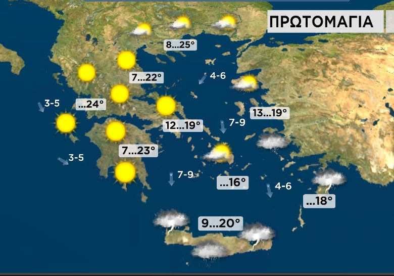 – Saturday (May 3): Partly cloudy in Crete and southern Dodecanese with some local showers; elsewhere, mostly clear with mountain clouds in the afternoon.