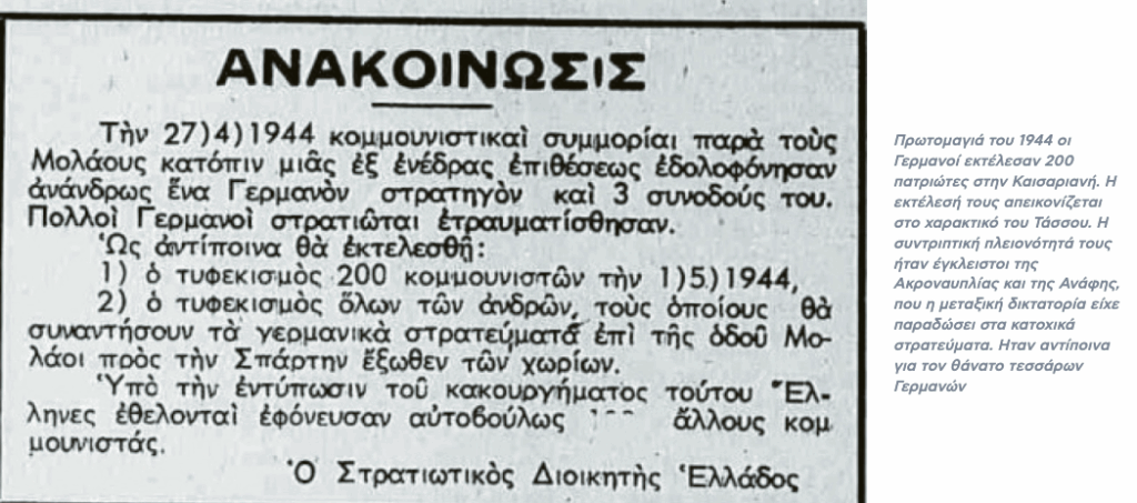 Yet, in this small place, visitors encounter a chapter of Modern Greek history that is both glorious and martyr-like. As you approach the wall where the German occupiers executed hundreds of Greek patriots, your steps, whether you want them or not, become heavier. You reflect on the heavy blood toll paid by innocent Greeks on the altar of Nazi efforts to crush their resistance spirit through horrific atrocities and to delay their liberation.