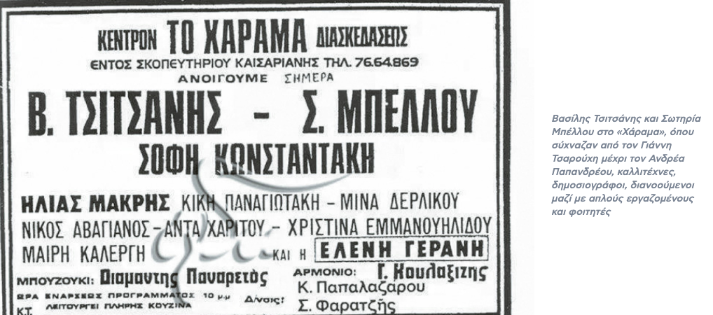 A few steps away is “Chara”, the remnants of which now exist. A symbol of post-war life in Athens, especially of the popular song scene, today a ruin with graffiti, metal sheets, and patches. It was initially linked to Giorgos Papaioannou and later flourished under Vassilis Tsitsanis, accompanied by Sotiria Bellou, with many other artists leaving their mark. Prime ministers, business magnates, scientists, and prominent personalities used to enjoy performances there, mingling with ordinary people, to the sounds of authentic Greek folk music. For devotees, it was a place of worship—a cultural, entertainment, and educational sanctuary. Its name, now spray-painted, reminds us of what it once was.