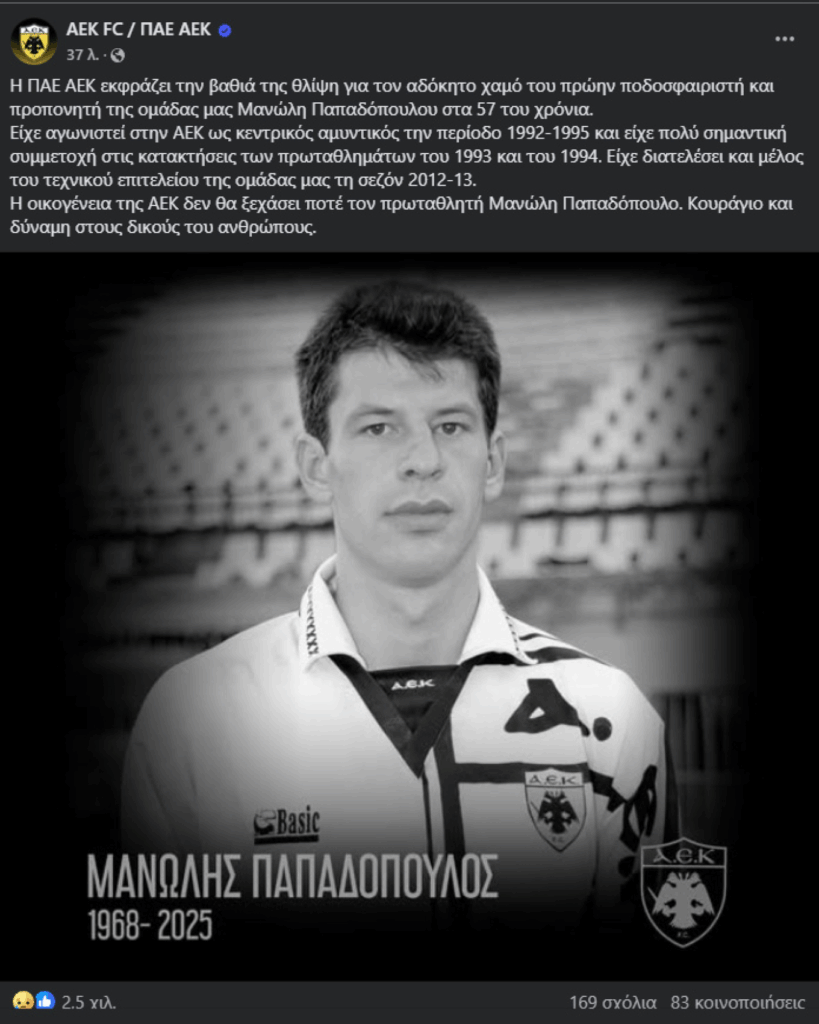 Manolis Papadopoulos died at the age of 57. He was born on April 22, 1968. As a player, he played as a central defender. He wore the jerseys of Olympiacos and Ionikos Nikaia before transferring to AEK in the summer of 1992.