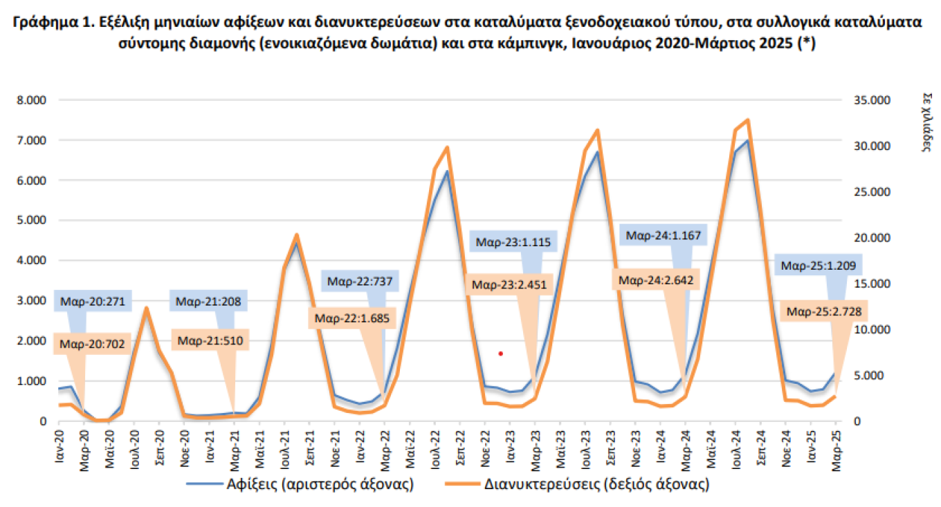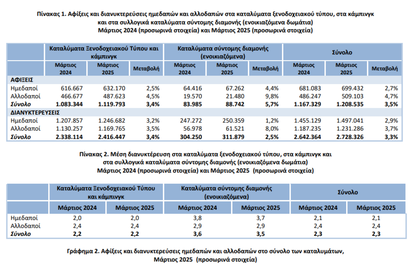 More specifically, according to preliminary data on hotel-type accommodations, campgrounds, and collective short-stay lodgings (rented rooms) published by ELSTAT, in March 2025, compared to March 2024, there was a 4.7% increase in arrivals and a 3.7% increase in overnight stays by foreign visitors.