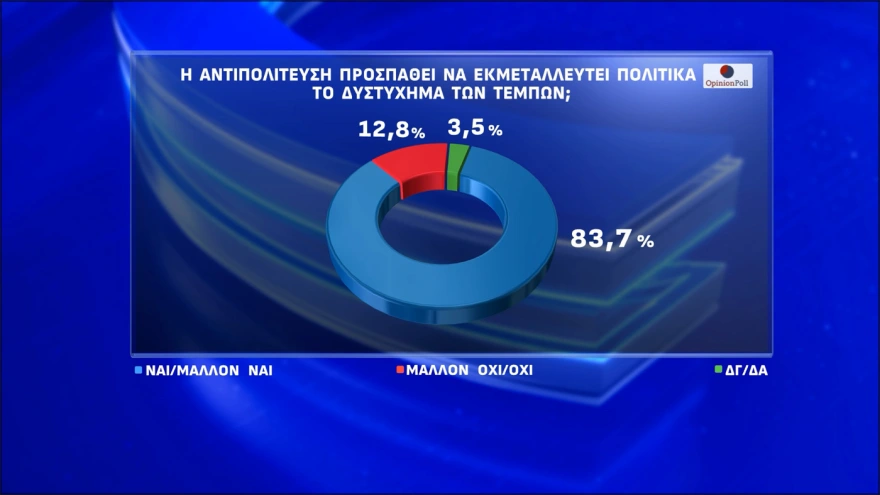 – 83.7% believe that the Opposition is trying to exploit the Tempi accident politically, compared to 80.7% in March. So there is an increase of 3%. Only 12.8% have the opposite opinion.