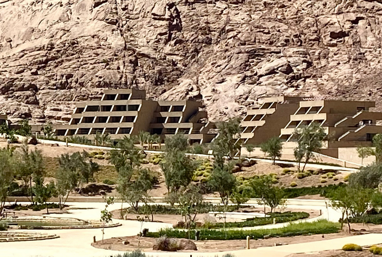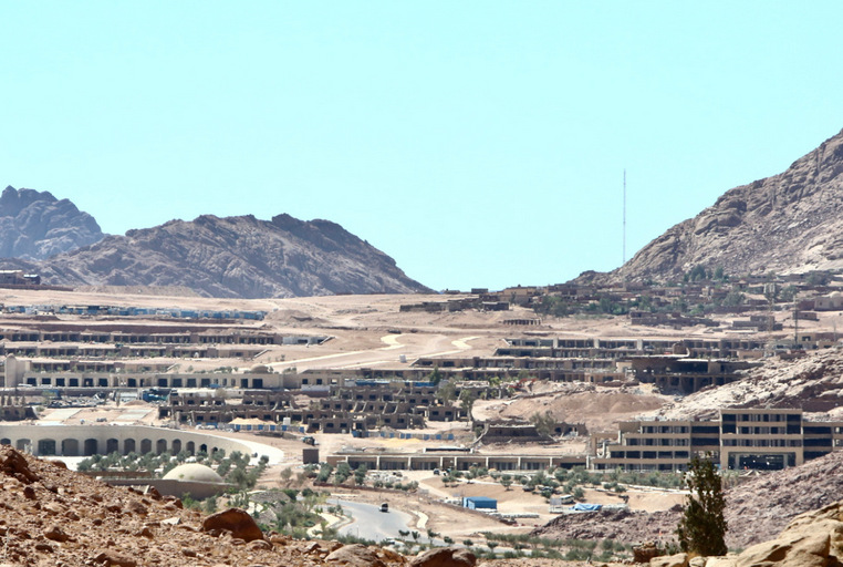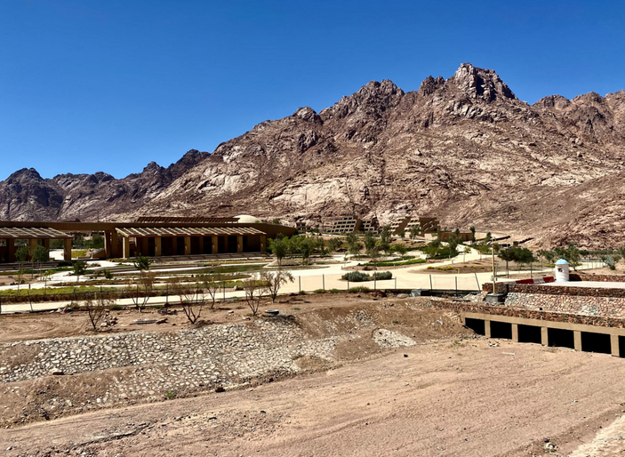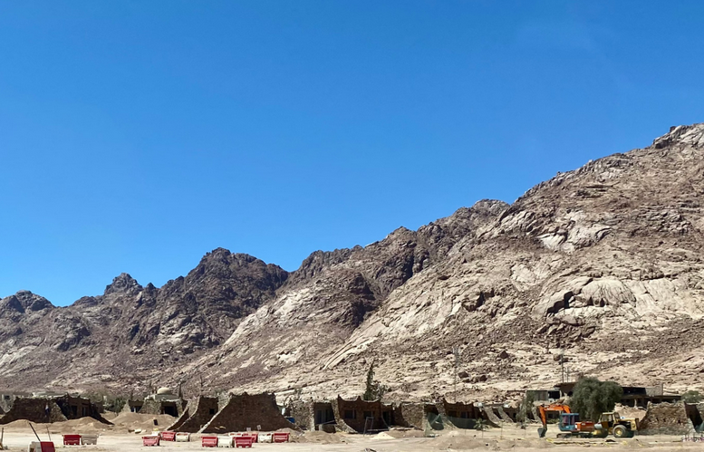 Descending the winding, asymmetrical road that leads out of the perimeter of the Monastery of Saint Catherine, the view that unfolds before you is almost surreal: in the sun-scorched valley, just a breath away from the sacred site, a colossal tourist project has already begun to take shape.