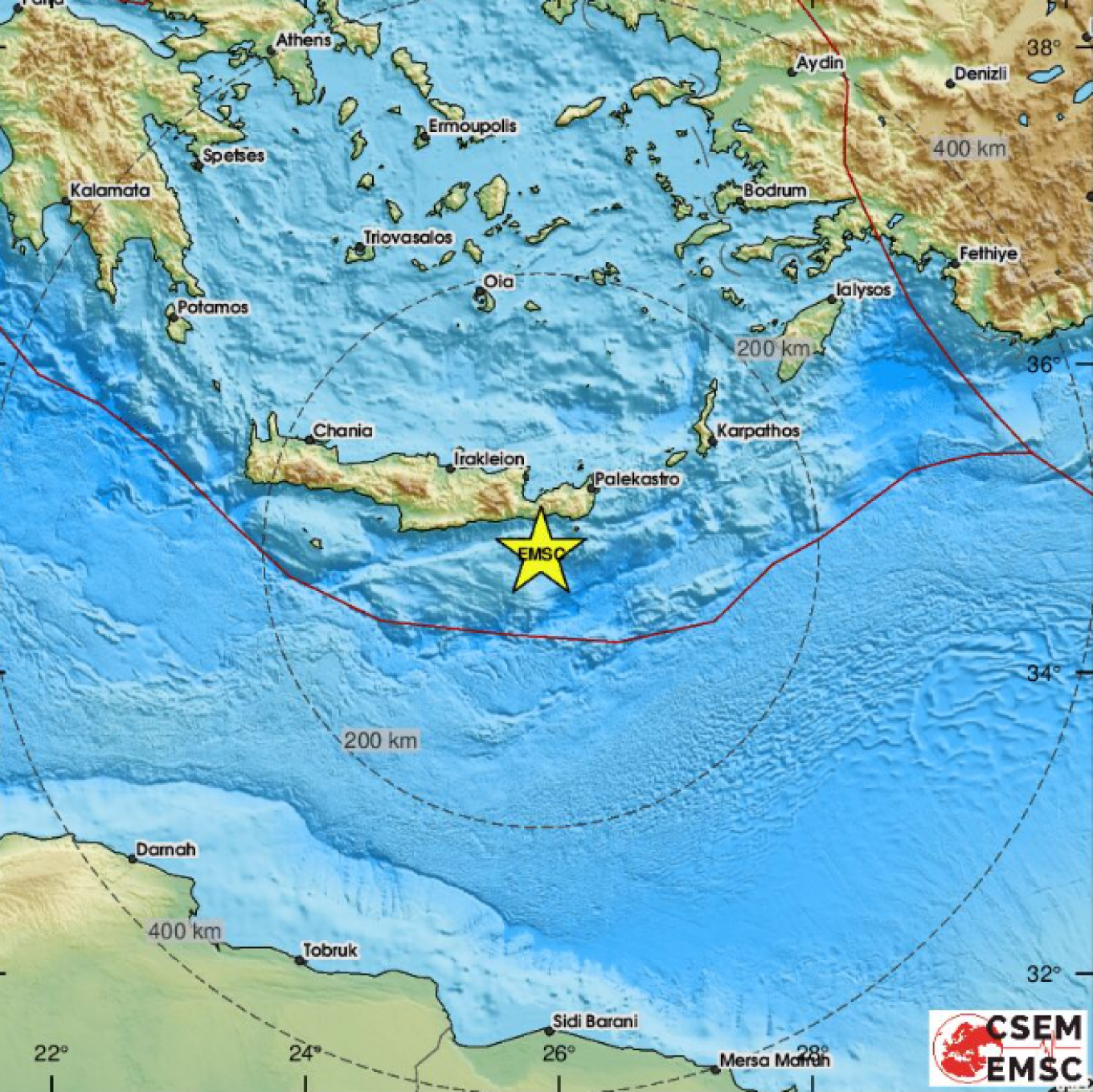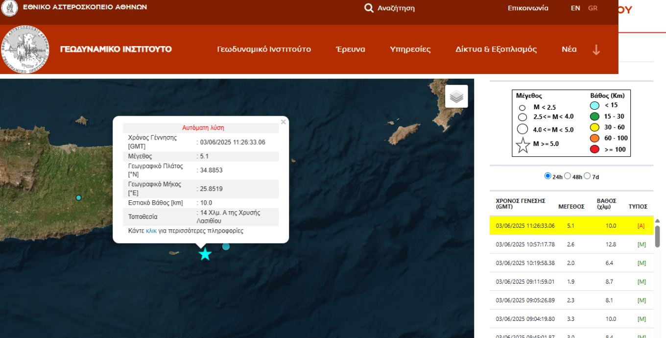 A 5.3 magnitude earthquake struck off the coast of Lasithi in Crete, with the epicenter located in the sea area east of the island.
