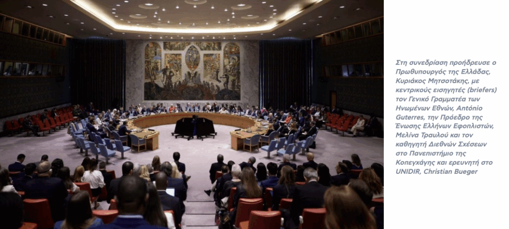 The meeting was chaired by the Prime Minister of Greece, Kyriakos Mitsotakis, with keynote speakers (briefers) the UN Secretary General, António Guterres, the President of the Hellenic Shipowners’ Association, Melina Traylou, and Christian Bueger, Professor of International Relations at the University of Copenhagen and researcher at UNIDIR.