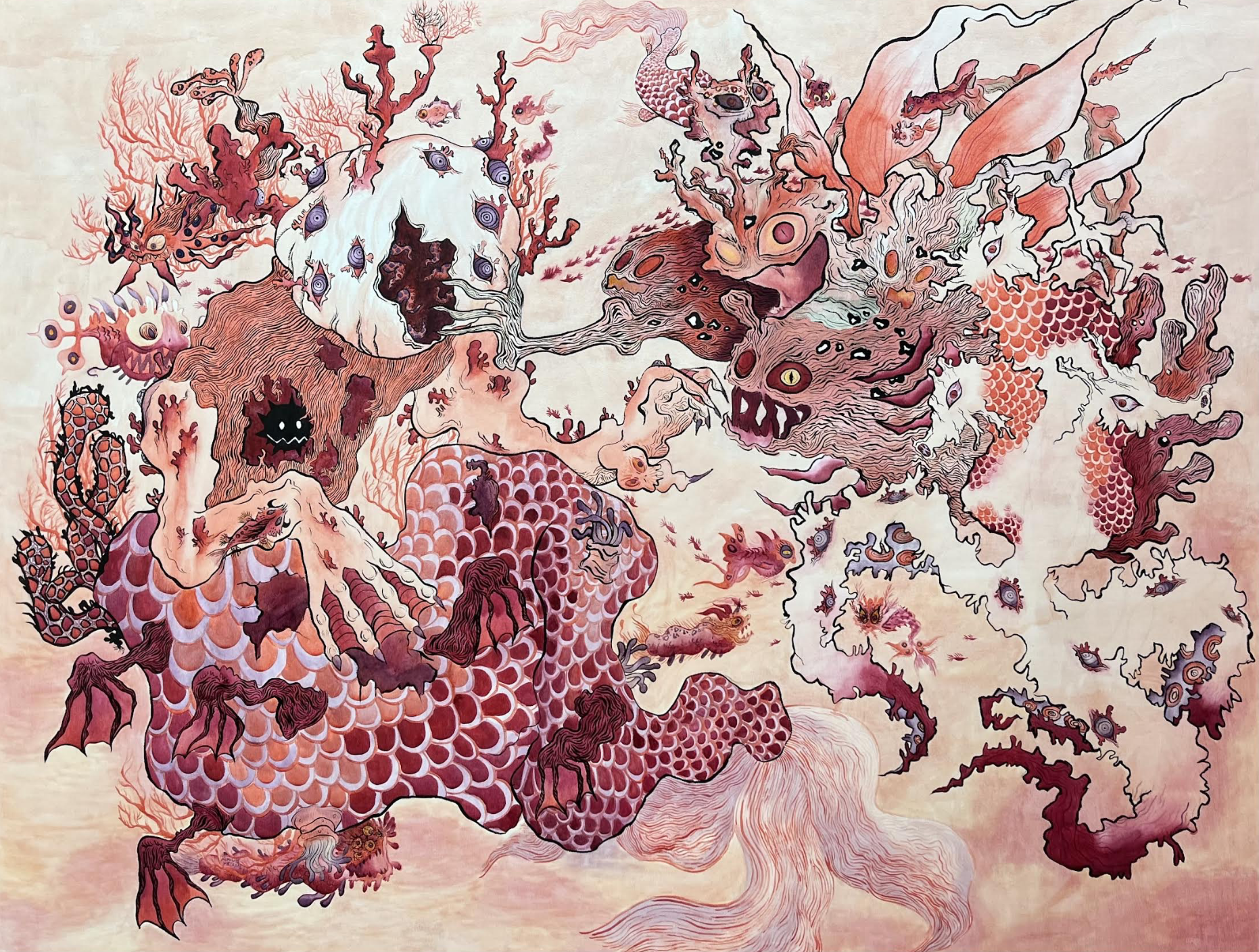 Employing an intuitive approach to painting, applying pigment directly onto the canvas allows the artist’s unfiltered emotion to emerge—free from the constraints of conscious thought. His compositions are often inhabited by jewel-adorned, cartoon-like creatures that invite viewers into a world of shared humanity, one grounded in intuition, innocence, and emotional truth.