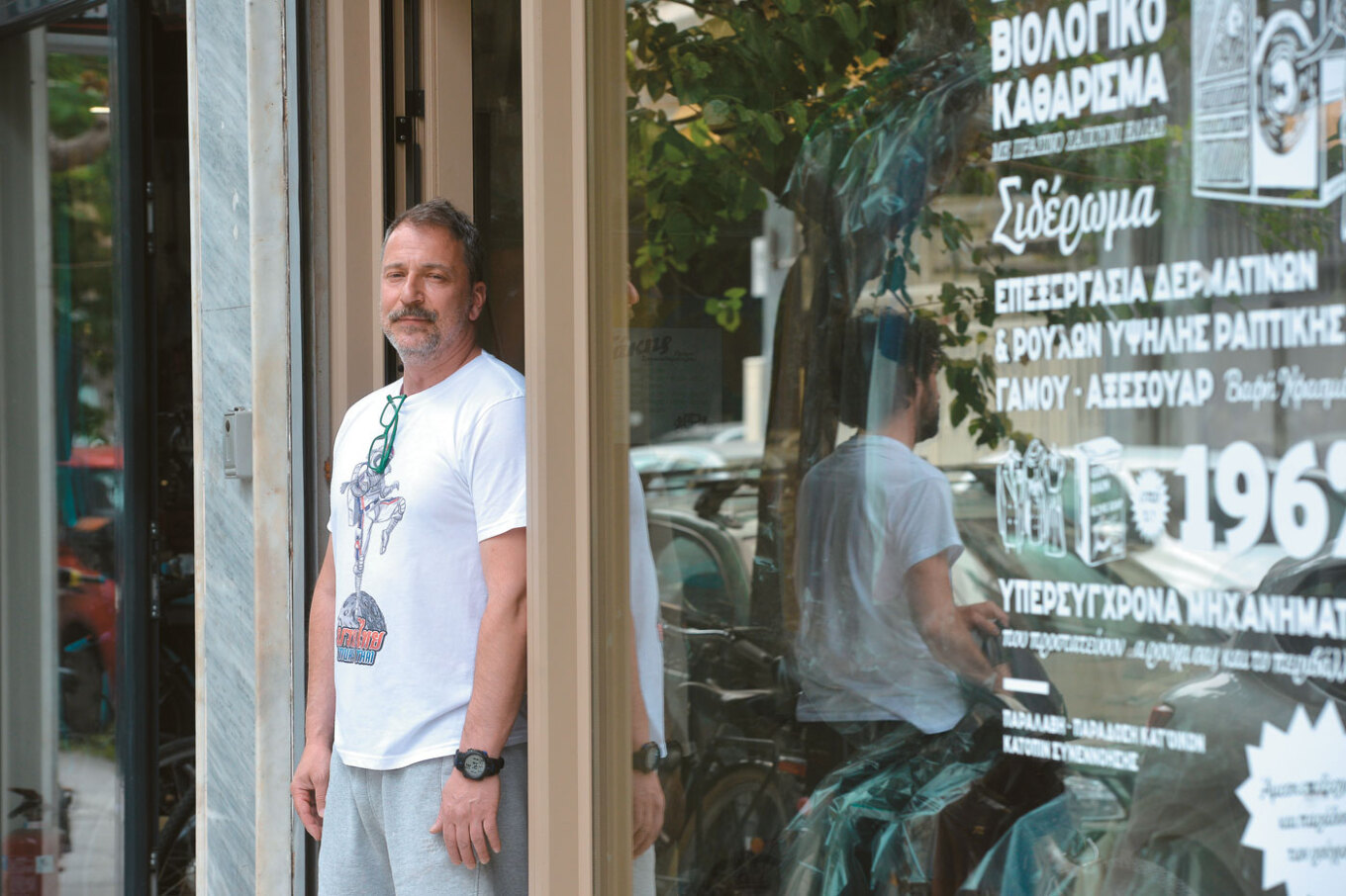 “It was the only shop among workshops and spare parts,” says Giorgos Mourikis about his parents’ dry cleaner, Anastasia and Panagiotis, which he now runs himself. Raised in the neighborhood, he remembers Falirou as a vacant lot up to Syngrou for playing football, and the fragrant pies made by housewives with the fruit from the “laden” mulberry trees.