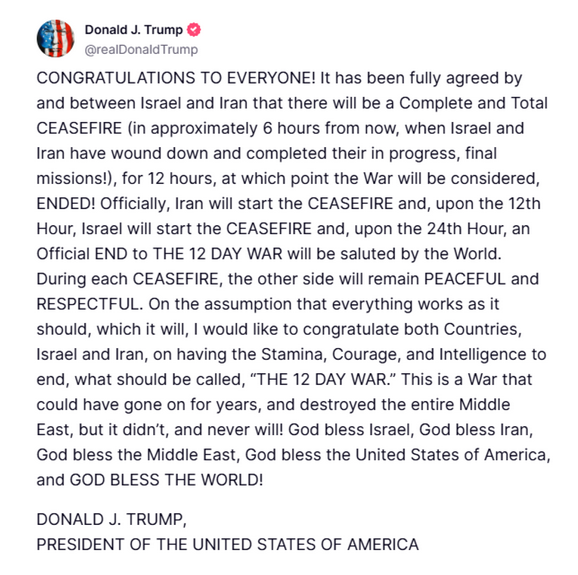 Donald Trump has just announced a “full ceasefire” between Iran and Israel.