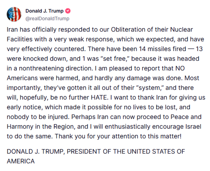 Trump’s statement came after Tehran’s missile attack on the Al Udeid base in Qatar and Ain al-Asad base in Iraq, in response to U.S. bombings of Iranian nuclear facilities.