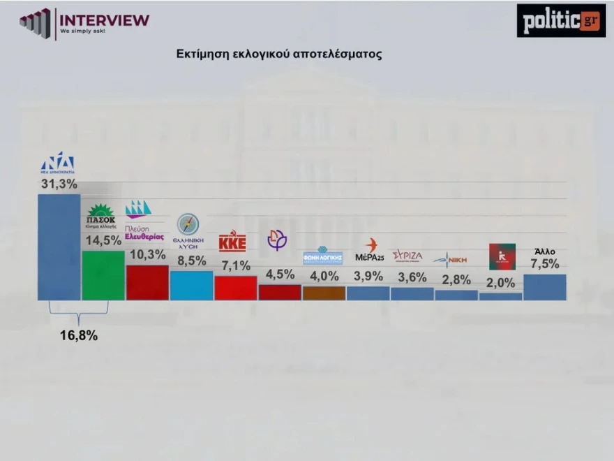 A recent poll conducted by Interview for Politic reveals a dramatic shift in the Greek political landscape, with SYRIZA, for the first time in recent history, falling below the parliamentary threshold at just 2.9% in voting intention. New Democracy (ND) maintains a commanding lead, estimated at 31.3%, while PASOK – Movement for Change (KINAL) holds steady in second place with 14.5%. Notably, the newer party Plefsi Eleftherias emerges as a significant force, polling third with 10.3%, signaling a reshuffling of the centrist and liberal electorate.