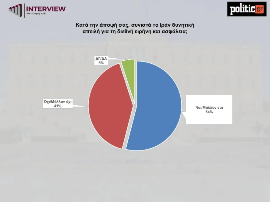 Regarding foreign policy, Greeks favor a balanced approach to the sensitive Greek-Turkish relations supporting both enhanced military deterrence and diplomatic dialogue without compromising national rights. Half of the respondents emphasize strengthening deterrence, while 36% advocate a hardline stance, rejecting any concessions. On the issue of Iran, opinions are divided but cautious; 54% view Iran as a threat to international peace, while 41% do not, reflecting ambivalence in the public mindset.