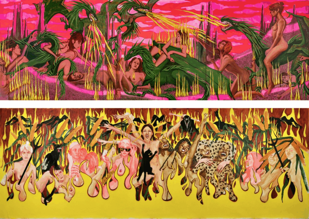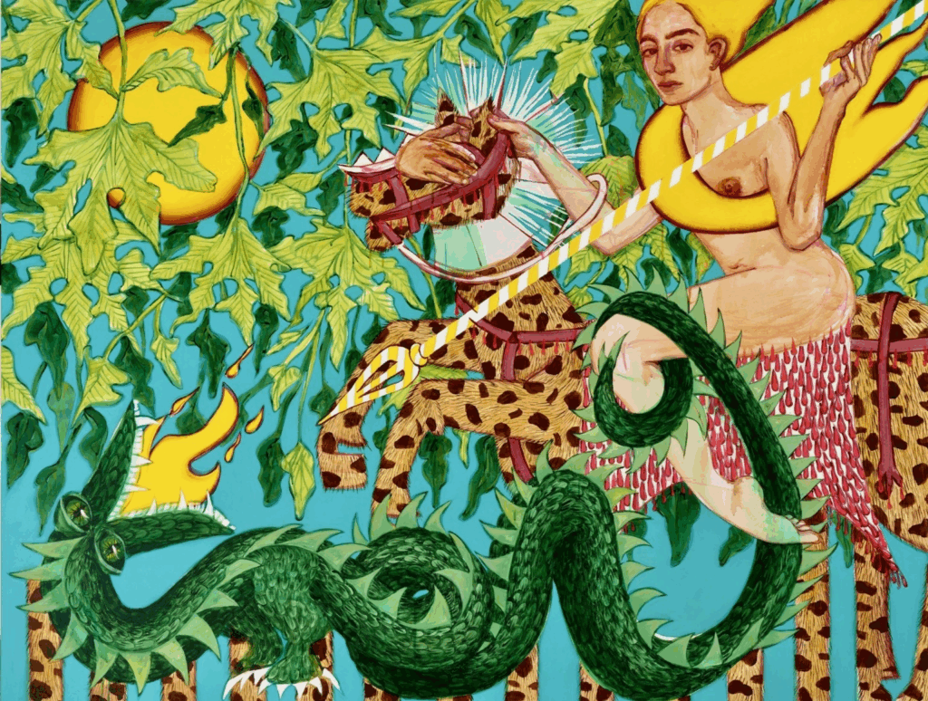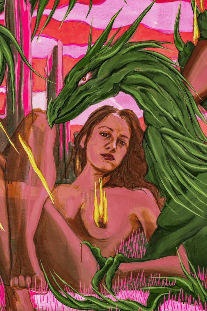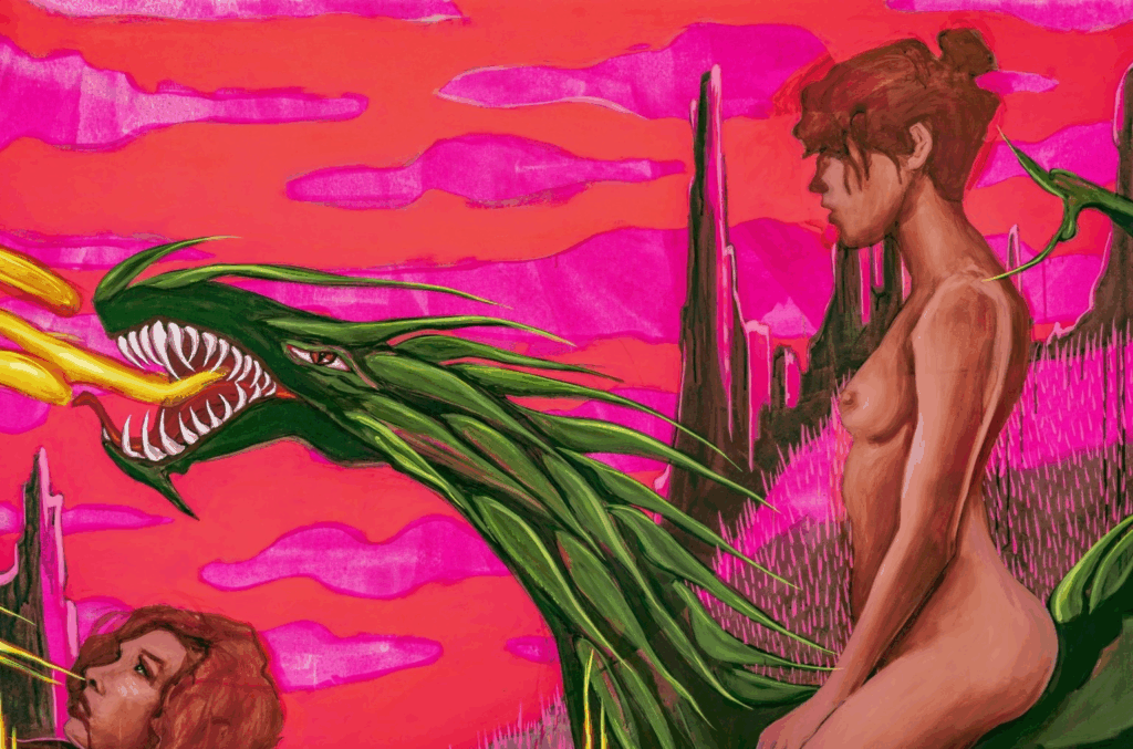 Stella Kapezanou’s latest exhibition, Bad Girls, Big Dragons, presented at the Athens Municipal Gallery, offers a spellbinding blend of new and earlier works, forming a dreamlike realm where mythical creatures and defiant female figures narrate stories of empowerment, pleasure, and resistance. At its entrance, a monumental 2 x 6 meter triptych featuring a dragon acts as both threshold and declaration — a call to reimagine the non-normative not as deviance, but as strength. Kapezanou invites us into a world that is untamed, ablaze, and fiercely feminine.