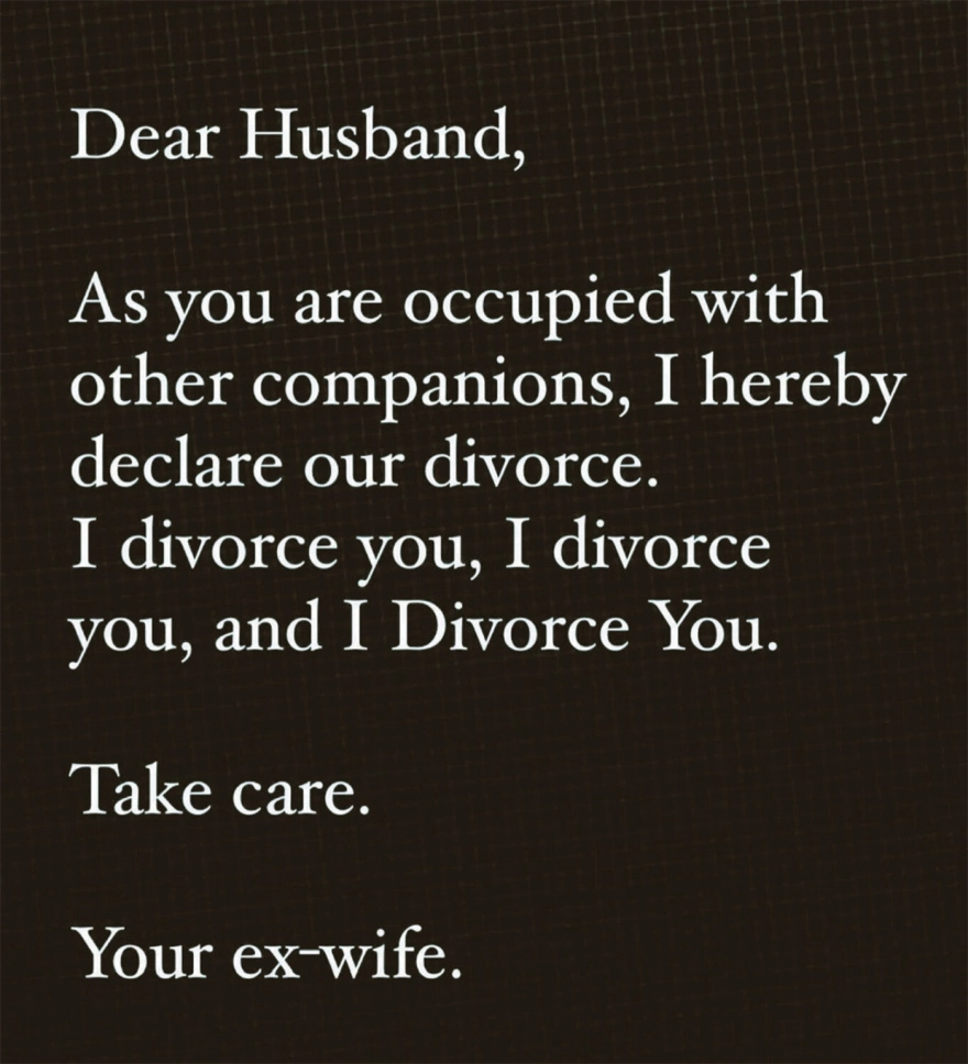“My beloved husband, since you are busy with other company, I announce our divorce. I divorce you, I divorce you, I divorce you. Take care, your ex-wife.”