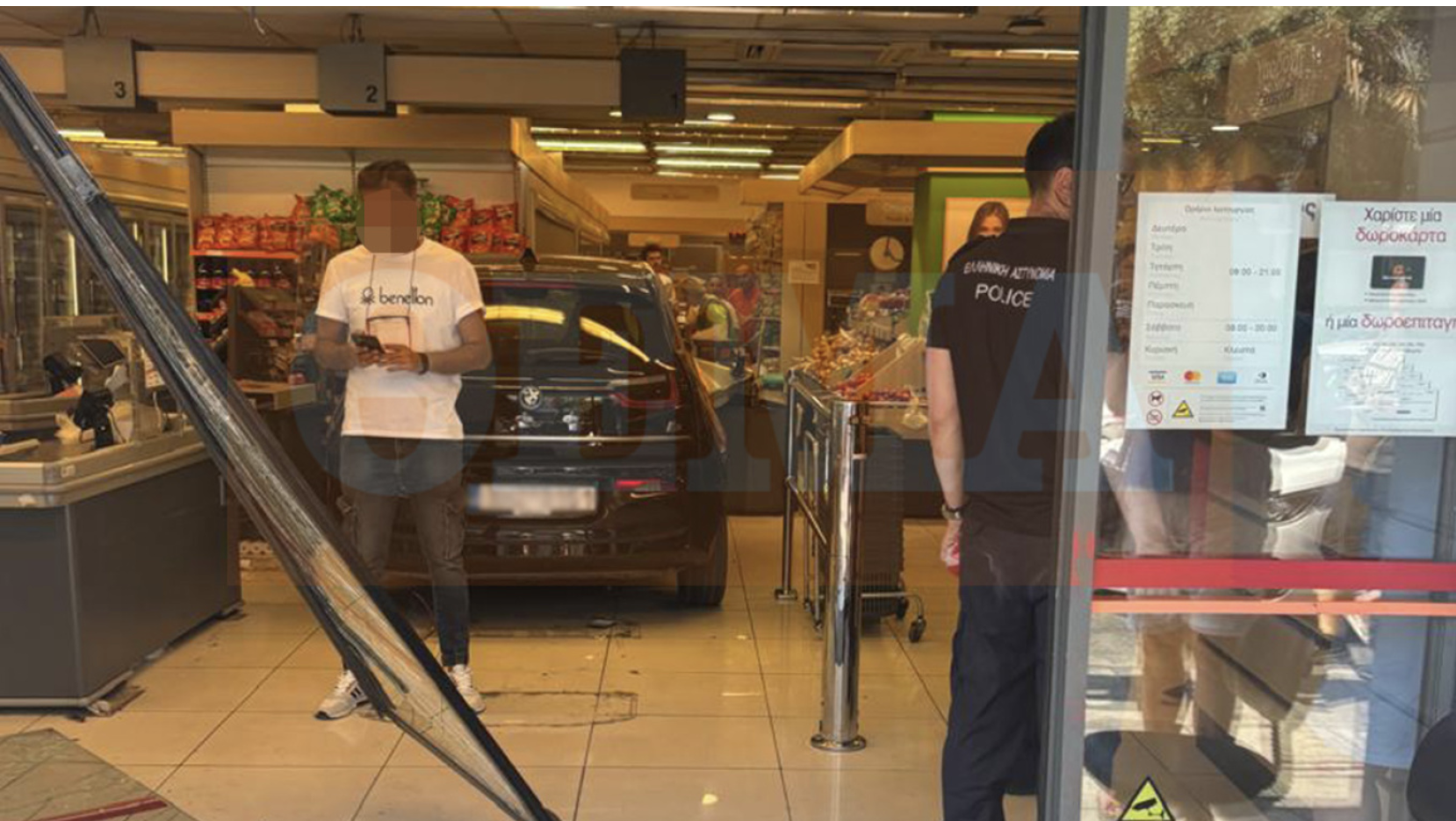 The crash happened in the direction toward Keratsini, in the Nikaia area, when the car veered off course and collided with the supermarket’s facade.