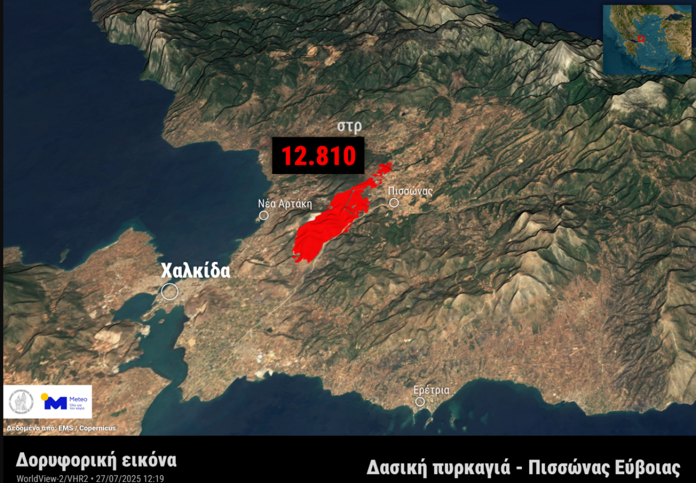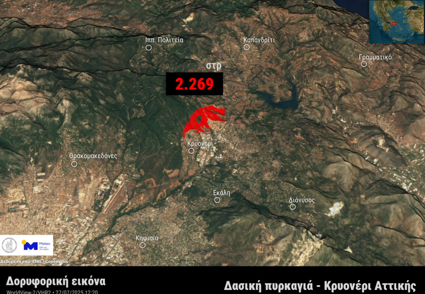High-resolution satellite data from the WorldView-2 satellite (VHR2 sensor), which passed over the affected areas at noon on Sunday, July 27, 2025, was processed by the team at meteo.gr / National Observatory of Athens, revealing the extent of the areas impacted by the recent forest fires in Kythera, Pissonas in Evia, and Kryoneri in Attica.
