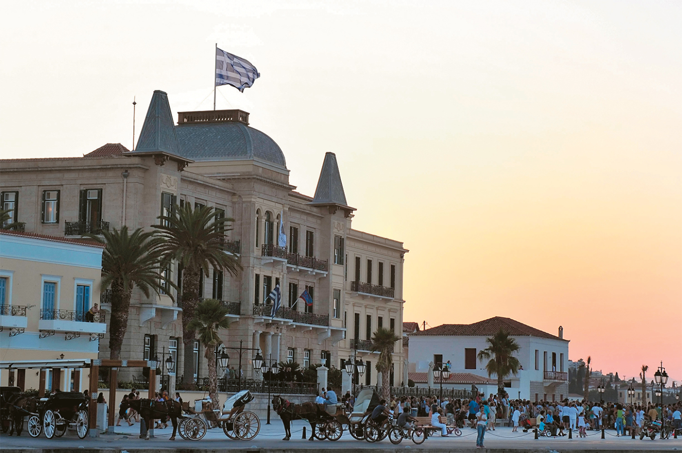 With mansions of unique architecture, pebble-laid alleyways, marble squares, traditional shipyards, and horse-drawn carriages, vehicles nearly insult the bronze statue of Bouboulina gazing over Baltiza, the old harbor, and the grand Poseidonion hotel, opened in 1914 and reminiscent of Belle Époque Riviera palaces.