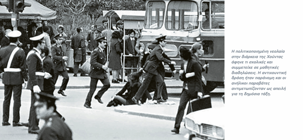 During the dictatorship, youth delinquency took on a political dimension. Politicized students skipped school to participate in protests. Anti-junta activity was illegal, and teenagers involved were treated as threats to public order and national security, facing potential imprisonment. Religious instruction and discipline were reinforced as tools of control. The Korydallos Reformatory played a key role in shaping behavior. After the restoration of democracy (Metapolitefsi), the term “delinquency” replaced “criminality” when referring to minors, to avoid stigmatizing them as criminals.