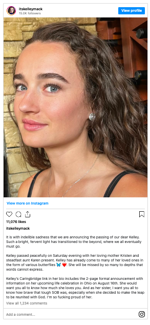“With unbearable sadness, we announce the passing of our beloved Kelly. Such a bright and warm light has crossed to the other side, where we will all eventually meet again. Kelly passed peacefully on Saturday night, with her beloved mother Kristen and her aunt Karen by her side. Kelly has already visited many of her loved ones in the form of various butterflies. She will be missed by so many—words cannot express the loss.”