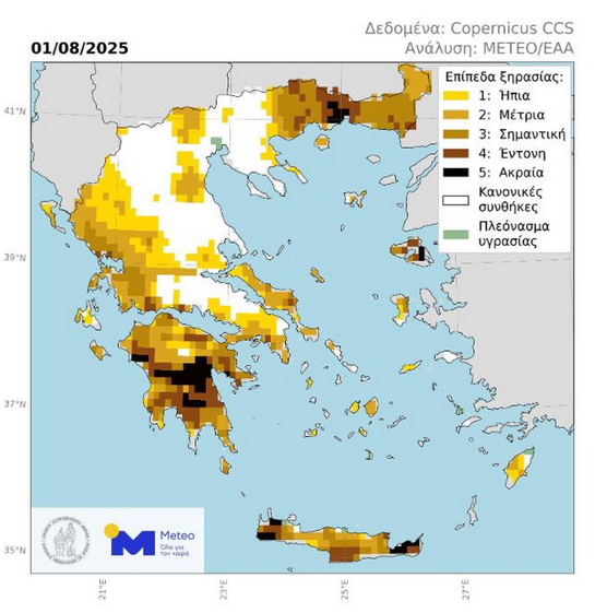 The map below depicts the drought index in Greece on 1 August 2025, according to the analysis of the EAA METEO team. As can be seen, with the exception of several areas of Macedonia, Thessaly and central Central Central Greece, the country is in drought conditions. Large parts of Crete, the Peloponnese, eastern Macedonia, Thrace and Lesvos are affected by severe or extreme drought (levels 4 and 5). Many areas of Attica, Evia, western Central Greece and Epirus are in a moderate or severe drought (levels 2 and 3), as well as many of the country’s islands. Following the particularly high temperatures and low rainfall in July, almost all of the country is in a higher-than-seasonal drought level than at the beginning of last month.