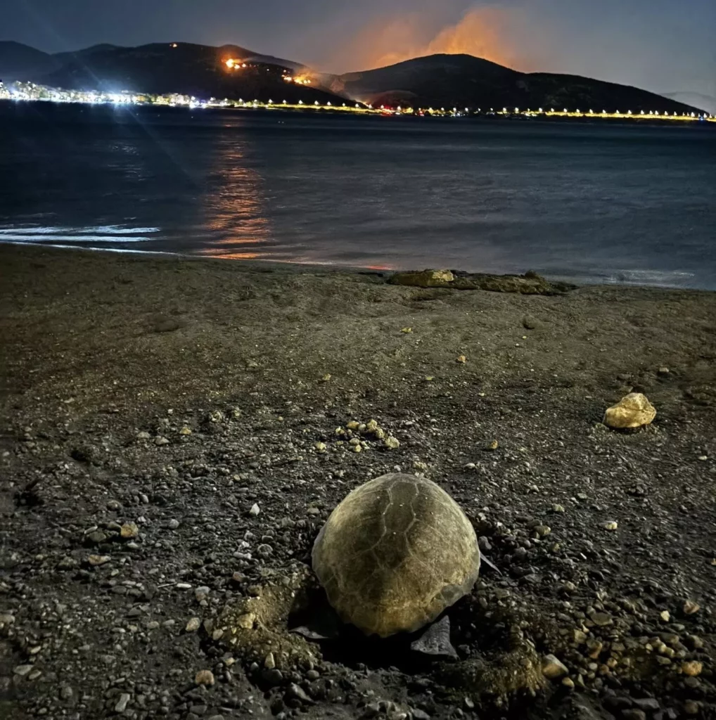 The images circulating evoke mixed emotions. On one hand, there is the sea turtle choosing this spot for a deeply significant moment — a miracle of nature, as she lays her eggs. On the other hand, in the background, terrifying flames from the Keratea forest are devouring every tree and creature in their path.