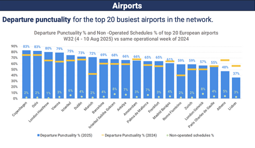 Nevertheless, overall traffic at airports across Europe is so far at 99% of 2019 and up 4% compared to August last year, with Greece, yes, having long since surpassed its 2019 performance in terms of traffic growth compared to other major tourist markets in the Mediterranean, but also recording a far from negligible negative performance: Indeed, our country this August has the positive performance of being at +20% compared to 2019 for the “hot” European holiday week of August 4-10, 2025. However, along with France in first place and Spain in third place, Greece in second place, Greece also had the longest flight delays, something that many travelers who chose to fly to their holiday destinations found out in practice.