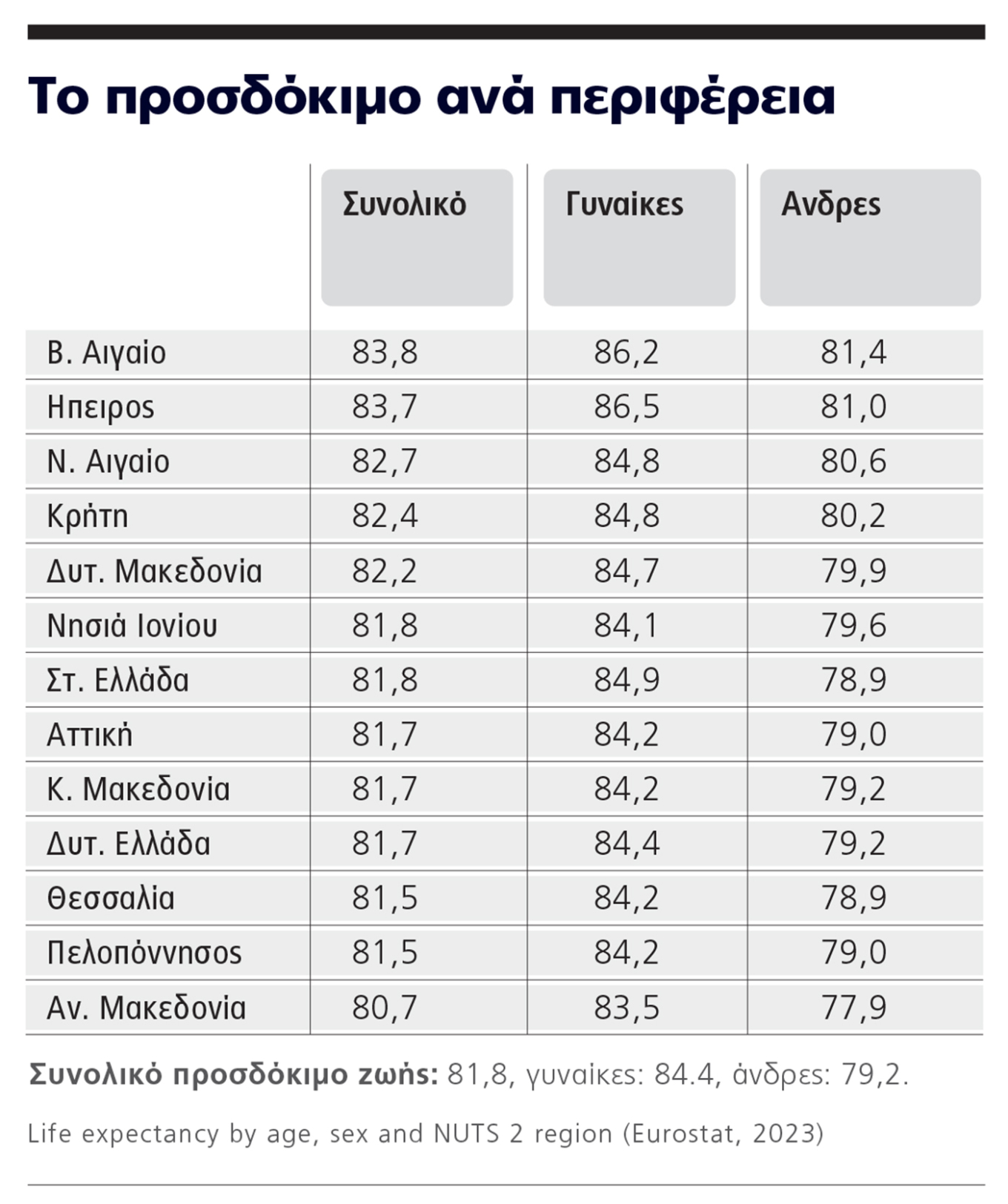 According to Eurostat data (2023), the women of Epirus lead longevity in Greece. However, in combined averages of men and women, the longest-lived Greeks are in the North Aegean islands, where life expectancy reaches 83.8 years.