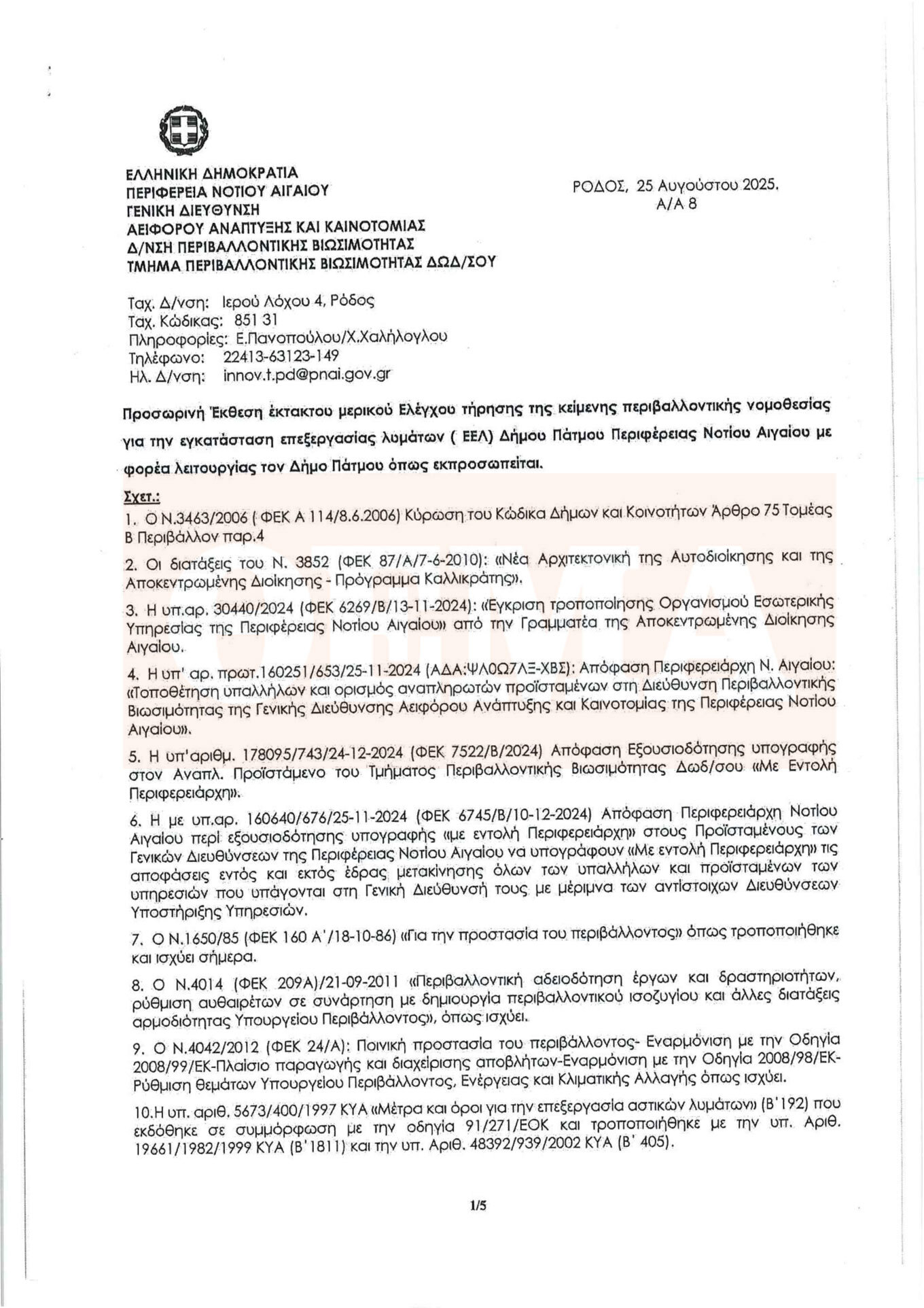 A series of violations leading to water quality degradation in Patmos and direct discharge of untreated sewage into the sea were identified by officials from the South Aegean Regional Environmental Directorate at the island’s Wastewater Treatment Plant.