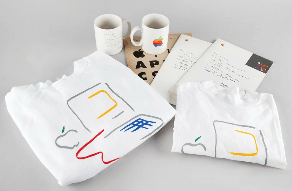 Vintage coffee mugs, stickers, badges, greeting cards, pens, pencils, tote bags, and T-shirts recreate the atmosphere of a bygone era — back when two friends assembled the first Apple computers in a garage.