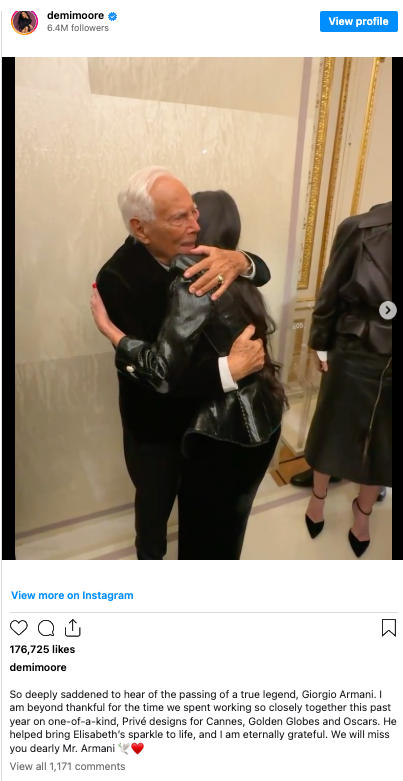 As news of his passing spread, so did reflections on his iconic collaborations with stars like Beyoncé, Salma Hayek, Gwyneth Paltrow, and Taylor Swift. Stylist Brad Goreski recalled Armani’s designs worn by Demi Moore during last year’s awards season. At the 2025 Golden Globes, where Moore won her first major award for a dramatic role, she stunned in a dazzling Armani Privé gown that echoed the shine of her trophy. “We were truly lucky to wear such incredible Privé creations at Cannes and to have custom gowns for the Golden Globes and Oscars,” Goreski wrote. “Thank you for the beautiful memories and the honor of working with you.”