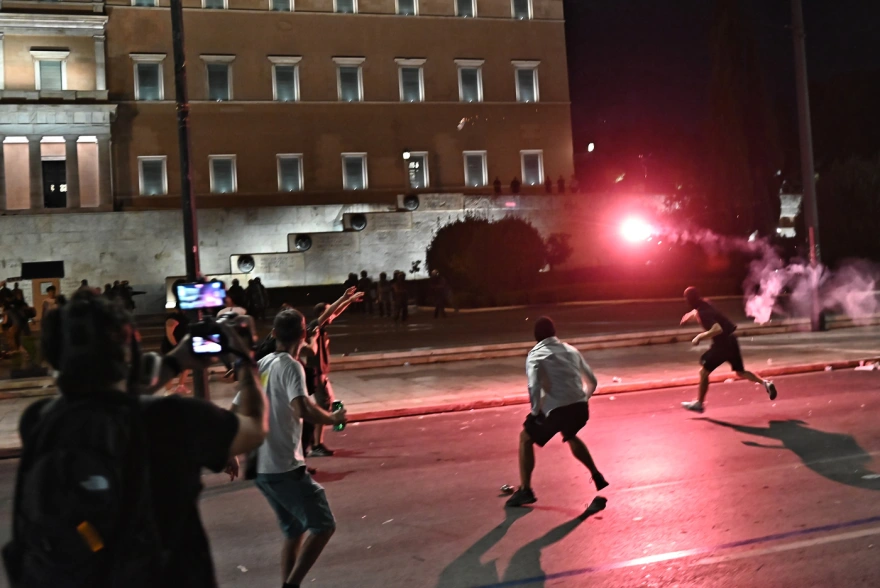 In response, riot police (MAT) deployed tear gas and ultimately dispersed the group between Ermou Street and Panepistimiou Street.