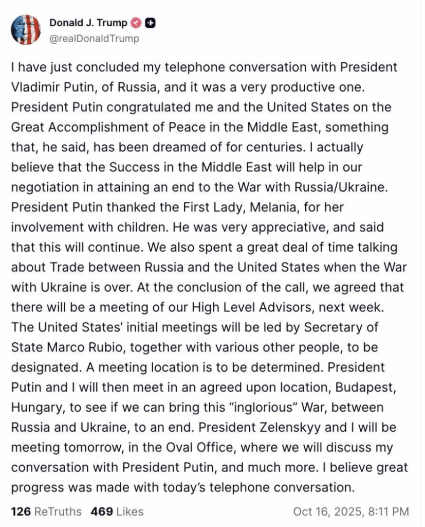 “I am speaking to President Putin now. The conversation is ongoing, a lengthy one, and I will report the contents, as will President Putin, at its conclusion,” Trump wrote in his message.