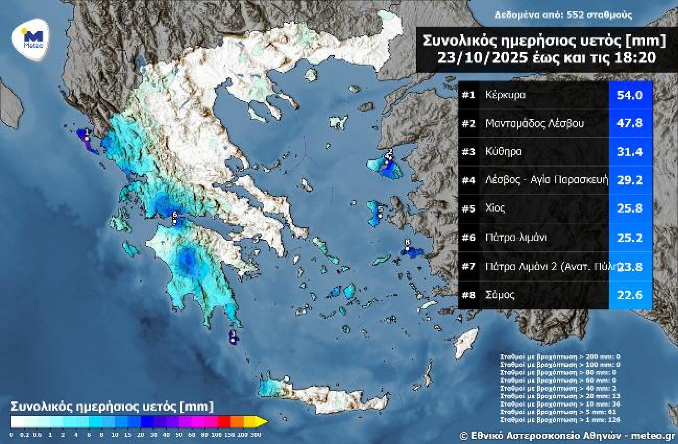 Heavy rainfall was recorded on Thursday, October 23, mainly in western Greece, the Peloponnese, and the eastern Aegean islands. According to the network of automatic weather stations of meteo.gr / National Observatory of Athens, the highest amount of rain by 18:20 was recorded in Corfu, reaching 54 millimeters.
